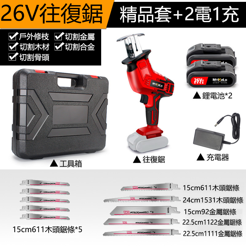 半小時前【德國精工鋰電鋸】鋼、鐵、磚頭、木材,統統都能鋸!續航久、充電快,方便攜帶,一機多用 - 26V德國精工往複鋸(機頭+1充2電)贈塑箱+5鋸條+大/5鋸條NT$2590