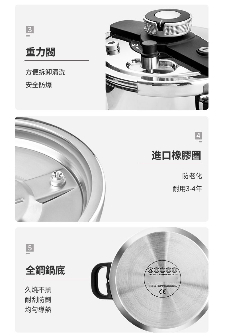 半小時前德國進口304不鏽鋼壓力鍋|燃氣電磁爐通用|安全升級限壓閥|燉肉煮飯熬粥一鍋搞定 - 升級版八重保護304不鏽鋼重力閥6L強力壓力鍋(3-6人)NT$2580