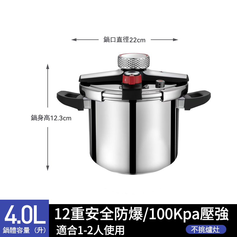 4分鐘前德國進口304不鏽鋼壓力鍋|燃氣電磁爐通用|安全升級限壓閥|燉肉煮飯熬粥一鍋搞定 - 升級版八重保護304不鏽鋼重力閥4L強力壓力鍋(1-2人)NT$2380