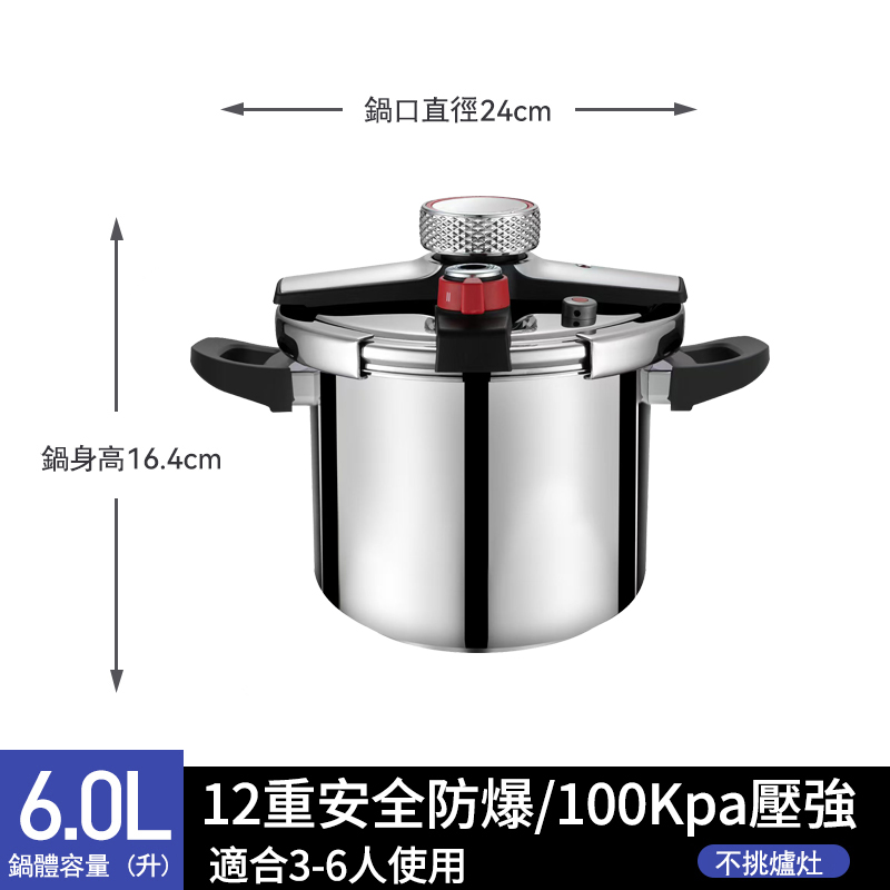 7分鐘前德國進口304不鏽鋼壓力鍋|燃氣電磁爐通用|安全升級限壓閥|燉肉煮飯熬粥一鍋搞定 - 升級加厚 6L【適合1-4人使用】304不鏽鋼壓力鍋 NT$2680