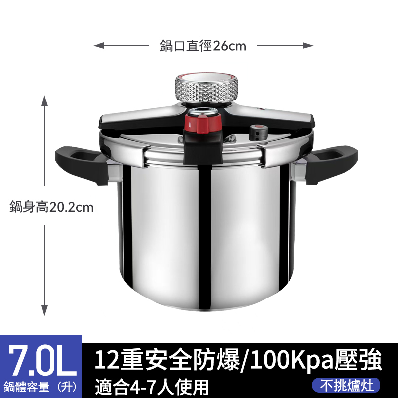半小時前德國進口304不鏽鋼壓力鍋|燃氣電磁爐通用|安全升級限壓閥|燉肉煮飯熬粥一鍋搞定 - 升級版八重保護304不鏽鋼重力閥7L強力壓力鍋(4-7人)NT$2780