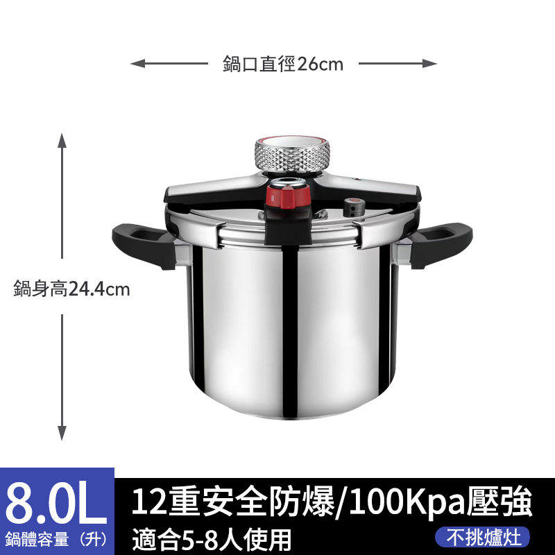 7分鐘前德國進口304不鏽鋼壓力鍋|燃氣電磁爐通用|安全升級限壓閥|燉肉煮飯熬粥一鍋搞定 - 升級加厚 8L【適合5-8人使用】304不鏽鋼壓力鍋 NT$3080
