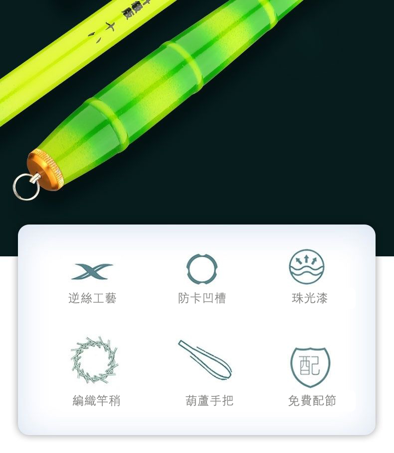 7分鐘前【新上市 買一送一】小玲瓏魚竿,37調綠竹魚竿 超細青竹釣手竿 - (買一送一)18尺(5.4m)+15尺(4.5m)+竿梢 NT$1750
