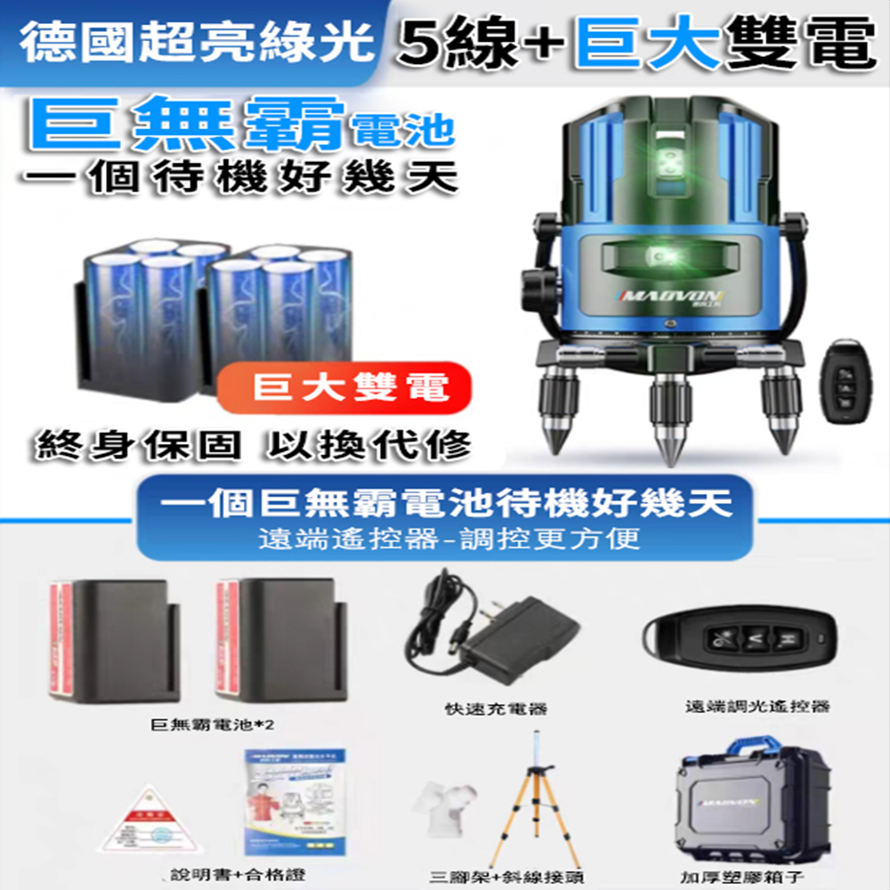 15分鐘前熱銷破萬件!戶外清晰可見【德國MAOVON】歐司朗綠光2/3/5線鐳射儀 - 【5線】巨大雙電+三腳架 +遙控 NT$3550